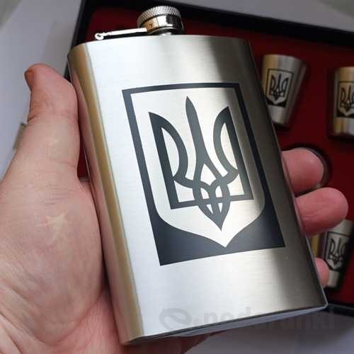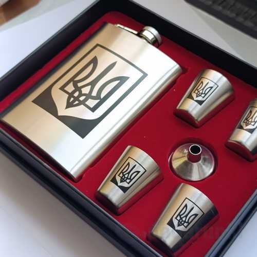 Купить подарочный набор фляга 270 мл + воронка + 4 стопки в украинском стиле с трезубцем из нержавеющей стали в красивой упаковке по лучшей цене с быстрой отправкой в Киеве и по всей Украине.