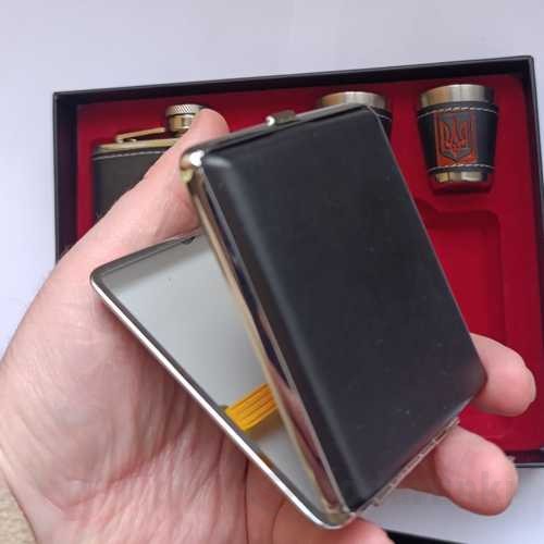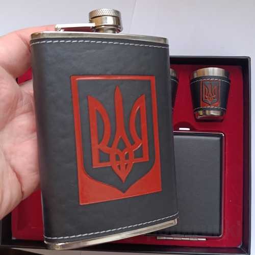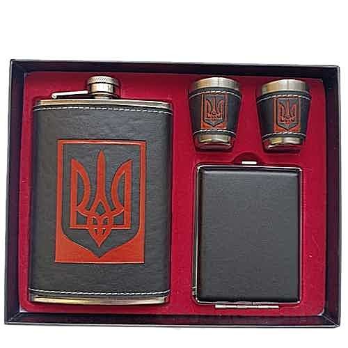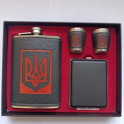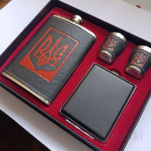 Купить подарочный набор фляга 270 мл + портсигар + 2 стопки в украинском стиле с трезубцем из нержавеющей стали в красивой упаковке, обтянутая кожей по лучшей цене с быстрой отправкой в Киеве и по всей Украине.