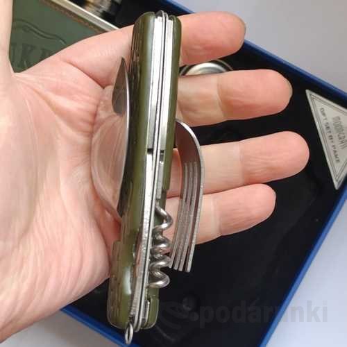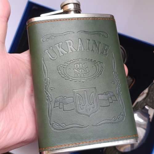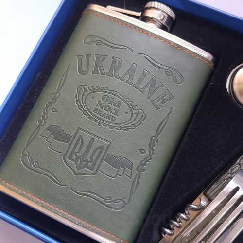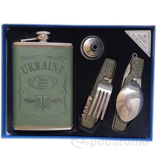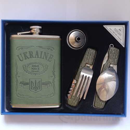 Подарунковий набір Фляга 270 мл UKRAINE + лійка + ніж видделка-ложка зелений